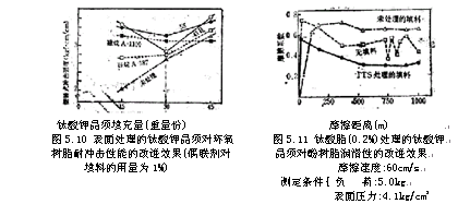 近年來工程塑料的應用越來越廣泛了,它們大多數(shù)是在樹脂中摻用無機填料的復合系統(tǒng),這時,用鈦酸酯處理無機填料,可以改善材料的機械強度和潤滑性。圖5.10指出,在環(huán)氧樹脂體系中,摻用以鈦酸酯處理的鈦酸鉀晶須填料,可以改進它的沖擊強度,而且效果優(yōu)于硅烷。圖5.11示出該種填料用于酚醛樹脂系統(tǒng)的效果,即可以使這種材料的摩擦系數(shù)降低。