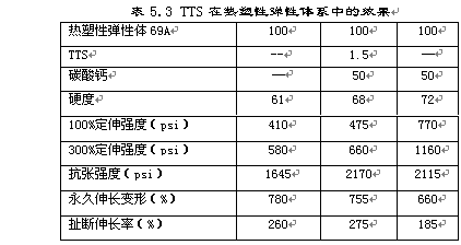 由表5.3可見,在熱塑性橡膠中借助于TTS就可以填充高達50重量份的碳酸鈣,并使抗張強度提高三分之一,定伸強度、伸長和永久變形保持不變。