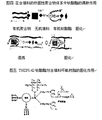 因?yàn)橐廊痪哂锈佀狨サ幕瘜W(xué)結(jié)構(gòu),所以在過(guò)剩的偶聯(lián)劑存在下,使表面能變化,粘度大幅度降低。在基體樹(shù)脂相由于偶聯(lián)劑的三官能基和酯基轉(zhuǎn)移反應(yīng),可使鈦酸酯分子偶聯(lián)。這就便于鈦酸酯分子的變型和填充聚合物體系的選用。見(jiàn)圖二、三、四、五。