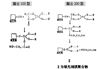 該類偶聯(lián)劑(除焦磷酸型外)特別適合不含游離水,只含化學(xué)鍵合水或物理鍵合水的干燥填充劑體系,如碳酸鈣、水合氧化鋁等,偶聯(lián)機(jī)理為:典型品種TTS