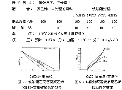 以低密度聚乙烯為例,如圖5.2所示,無填料的低密度聚乙烯的抗張強度約為130公斤/平方厘米,伸長率為530%,而填充40份碳酸鈣后,相應值為95公斤/平方厘米和80%,改用以鈦酸酯處理的碳酸鈣,可以做到抗張強度不變,而伸長率增大,鈦酸酯用量以2%為宜。